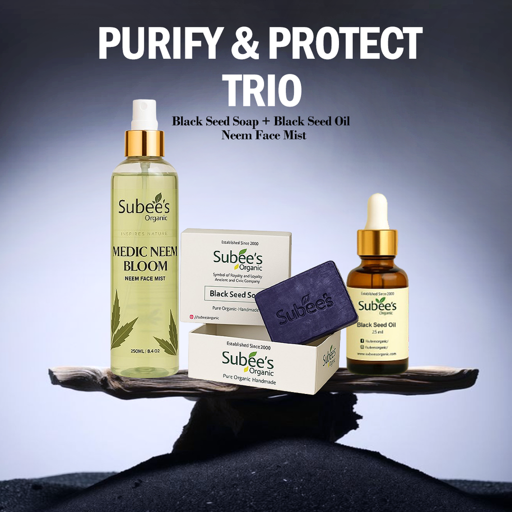 Achieve calm, clear, and naturally glowing skin with our Purify & Protect Trio. This powerful combination of Black Seed Oil, Black Seed Soap, and Tea Tree & Neem Face Mist is designed to deeply nourish, purify, and bala...